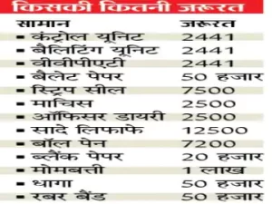 जिला निर्वाचन अधिकारी कार्यालय ने मतदान के दिन उपयोग होने वाले सामान की लिस्ट तैयार की है। मतदान के दिन मतदान केंद्रों को कंट्रोल यूनिट से लेकर वीवीपीएटी, रजिस्टर, कॉपी, पिन, पेन, पेपर, रबर बैंड, रेजर, धागे जैसे 80 से ज्यादा प्रकार के सामान की जरूरत होगी। भोपाल जिले में चुनाव के दौरान 39 लाख वोटर स्लिप की जरूरत होगी, तो 50 हजार बैलेट पेपर लगेंगे। इससे पहले जिला निर्वाचन अधिकारी उम्मीदवारों के लिए भी गाइड लाइन जारी कर चुके हैं।