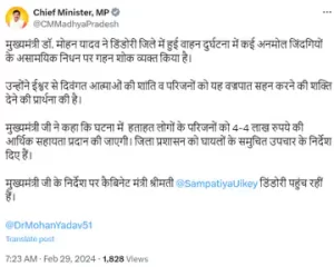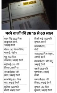 वाहन में लगभग 45 लोग सवार थे। हादसा बिछिया थाना क्षेत्र में गुरुवार तड़के तीन से चार बजे के बीच हुआ। मृतकों में 6 पुरुष और 8 महिलाएं शामिल हैं। सभी की उम्र 16 से 60 वर्ष के बीच है।