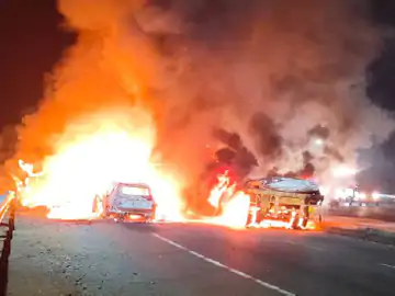 BREAKING NEWS- फोरलेन हाइवे पर ट्राले की टक्कर के बाद 4 गाड़ियों में आग: इंदौर के होटल व्यवसायी समेत 3 लोग जिंदा जले