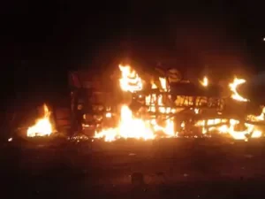 प्रारंभिक जानकारी के मुताबिक डंपर से टकराने के बाद बस में आग लगी है।