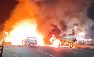 BREAKING NEWS- फोरलेन हाइवे पर ट्राले की टक्कर के बाद 4 गाड़ियों में आग: इंदौर के होटल व्यवसायी समेत 3 लोग जिंदा जले