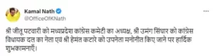 कमलनाथ ने नवनियुक्त पीसीसी चीफ जीतू पटवारी, नेता प्रतिपक्ष उमंग सिंघार और उप नेता प्रतिपक्ष हेमंत कटारे को बधाई दी।