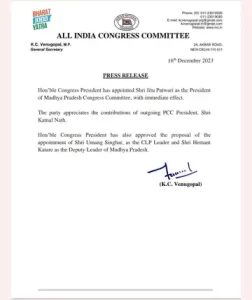 MP कांग्रेस में बड़ा बदलाव जीतू पटवारी बने प्रदेश अध्यक्ष: उमंग सिंघार नेता प्रतिपक्ष, हेमंत कटारे को उप नेता प्रतिपक्ष की जिम्मेदारी